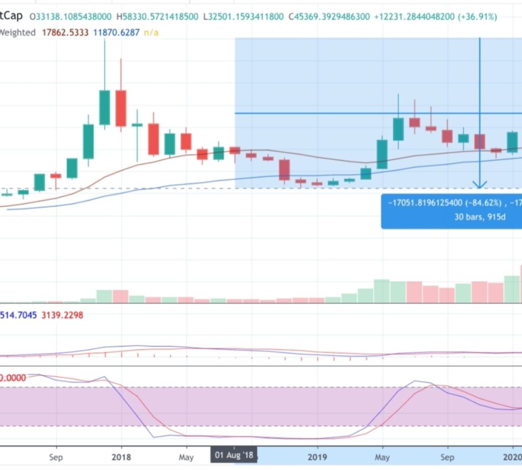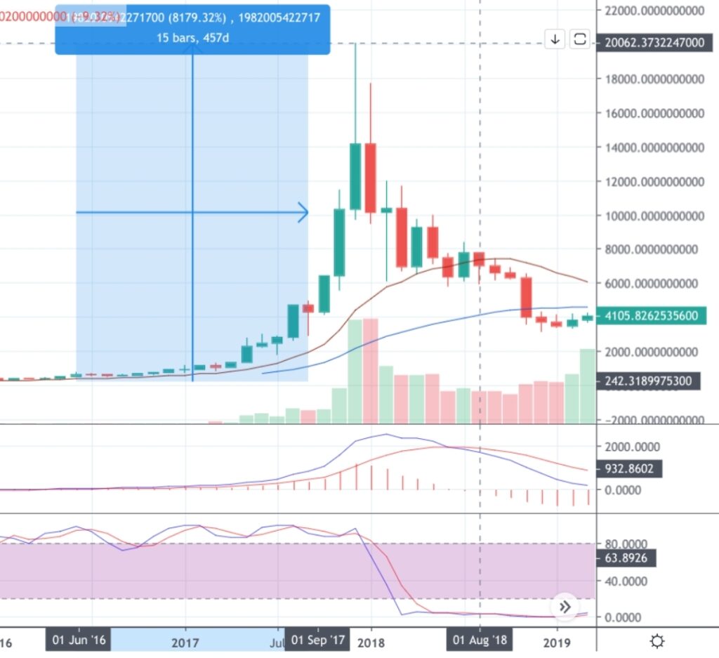 To understand Bitcoin’s volatility it makes sense to view the cycles it has had in the past. In April 2015, Bitcoin traded below $250. By the end of 2017, it had roughly an 8000% gain from the bear market lows. During 2018 Bitcoin dropped 84% down to slightly above $3,000.